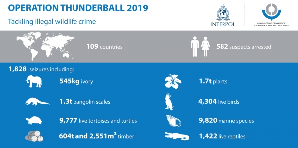 A joint worldwide customs and police operation has resulted in the seizure of large quantities of protected flora and fauna across every continent. From 4 – 30 June, INTERPOL and the World Customs Organization (WCO) coordinated Operation Thunderball, with police and customs administrations leading joint enforcement operations against wildlife and timber crime across 109 countries. The intelligence-led operation identified trafficking routes and crime hotspots ahead of time, enabling border, police and environmental officers to seize protected wildlife products ranging from live big cats and primates to timber, marine wildlife and derived merchandise such as clothing, beauty products, food items, traditional medicines, and handicrafts.